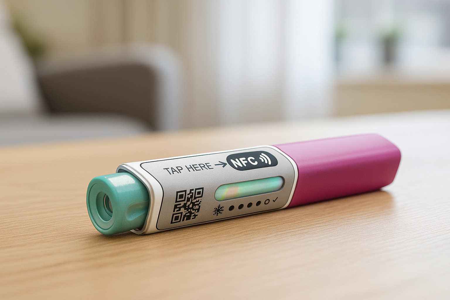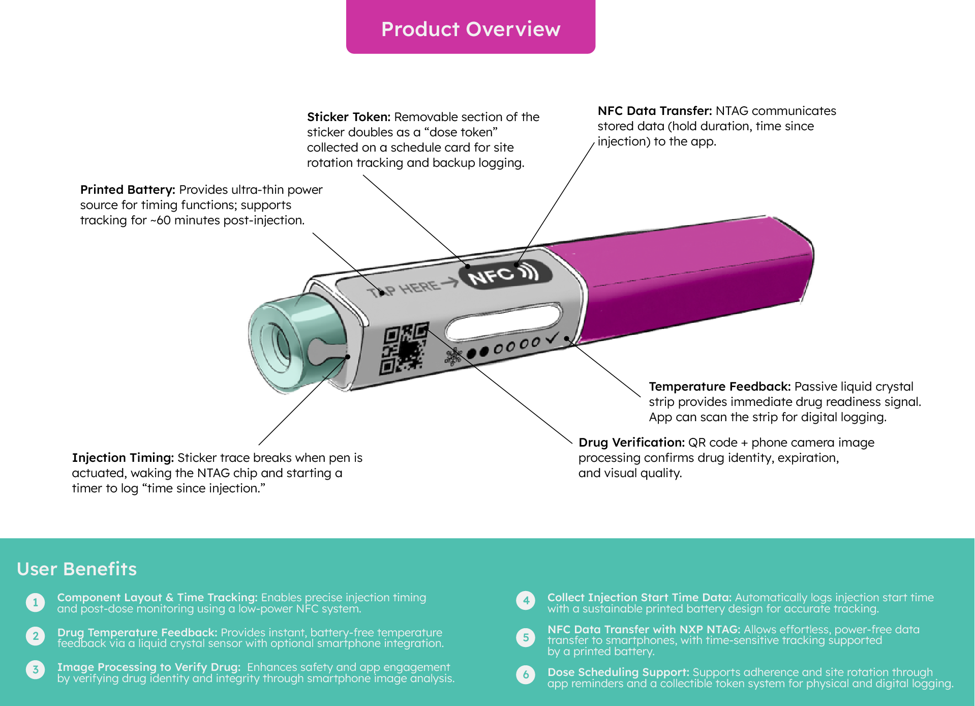 - Injection Timing: Sticker trace breaks when pen is actuated, waking the NTAG chip and starting a timer to log “time since injection.”