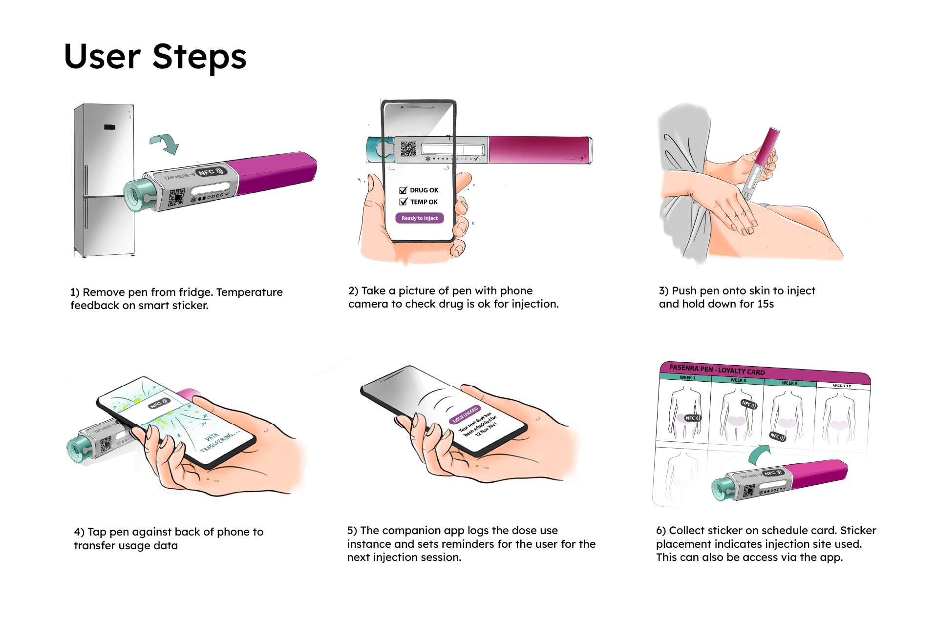 In this project, I explore how smart stickers—low-cost, flexible electronic labels—could transform the injection experience. Unlike embedded electronics, stickers offer a scalable pathway to integrate feedback, guidance, and data capture without redesigning the pen itself.